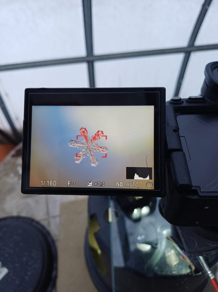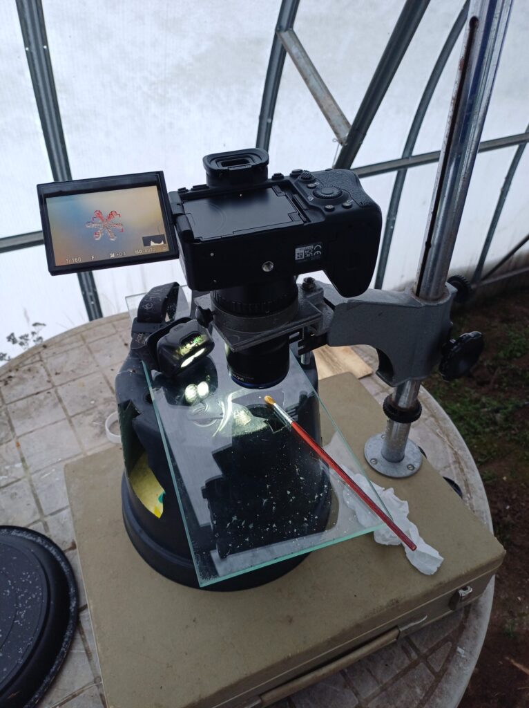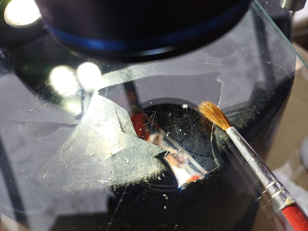 Nagu pildilt näha, siis enamus valikust on sodi 🙂 Ilusat lumehelvest käib kätte paraku väga harva. Kui valik tehtud, tuleb helves toimetada kuidagi kaamera alla. Mina kasutan pintslit. Millegi muuga torkima hakates helves lihtsalt laguneks.